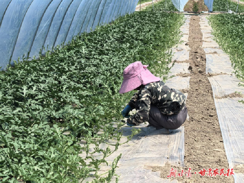 村民正仔细地检查着每一棵西瓜苗的生长情况。