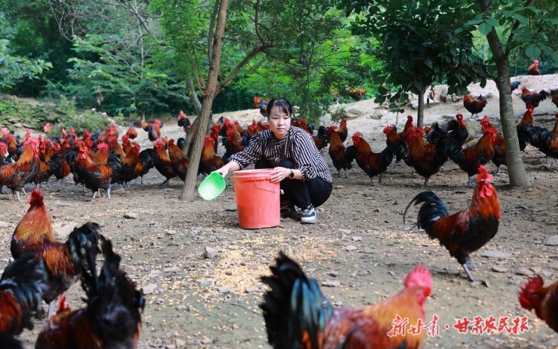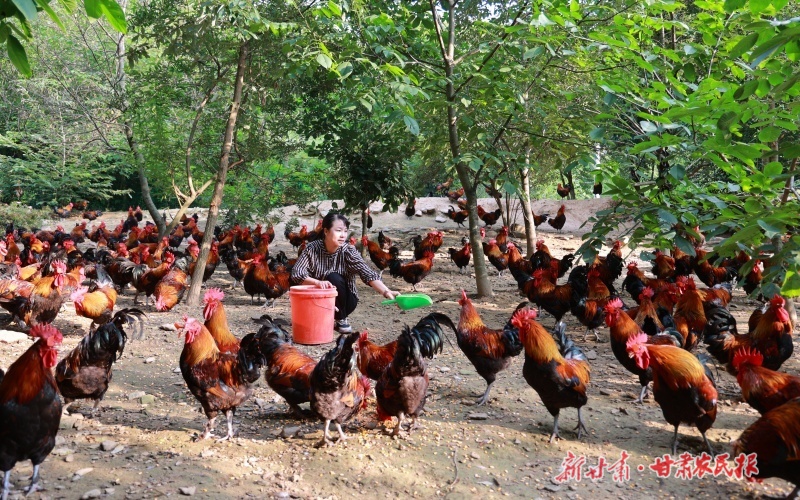 近年来,康县岸门口镇依托当地丰富的生态资源,鼓励农民大力发展林下中药材、木耳、土鸡、中蜂等特色产业,促进农民增收,助力乡村振兴。图为8月2日,康县岸门口镇鸿胜养殖农民专业合作社负责人杜红鹃在树林中给养殖的黑遥土鸡喂食。该合作社发展林下养殖土鸡32000只,年出栏25000只,年收入100多万元。新甘肃·甘肃农民报通讯员 黄培军