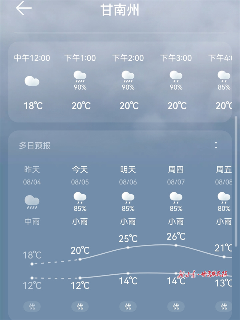 甘肃农民网讯(新甘肃·甘肃农民报记者 何香利 文/图)8月5日,记者从甘肃省气象局获悉,预计5日白天到夜间,甘南、临夏两州阴有阵雨或雷阵雨,其中甘南州局部地方雨量可达中雨;兰州、白银、定西、陇南、天水、平凉等市多云,局部地方阴有阵雨或雷阵雨;省内其余地方多云或晴,祁连山区阴有阵雨或雷阵雨。