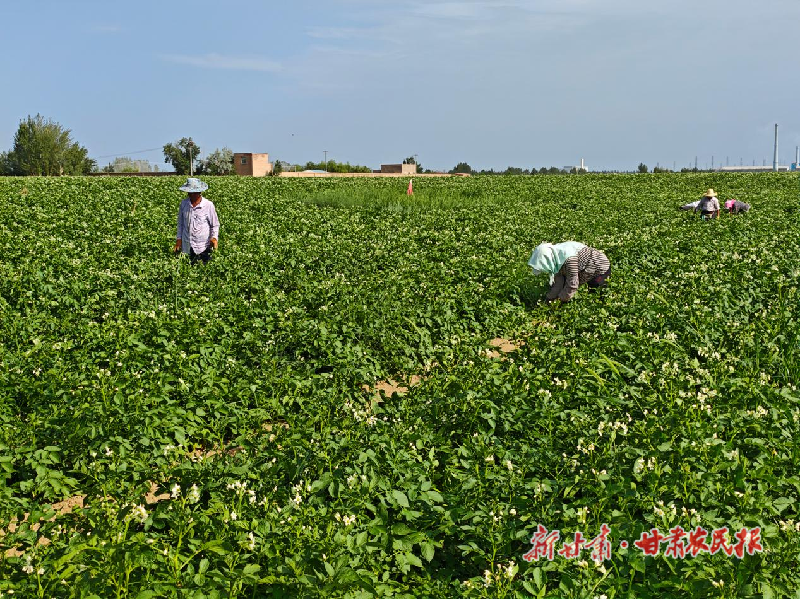 走进发放镇下沙子村马铃薯种植示范点,映入眼帘的是一片生机盎然的景象:白色的马铃薯花在蓝天白云的映衬下竞相绽放,随风摇曳,数十名工人穿梭于沟垄之间,有序开展除草、管护等工作。