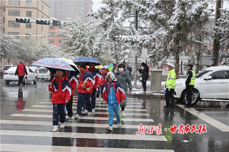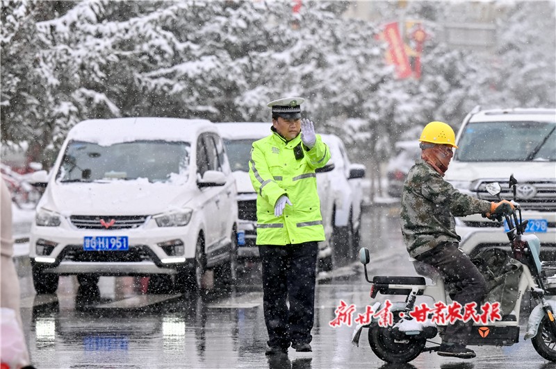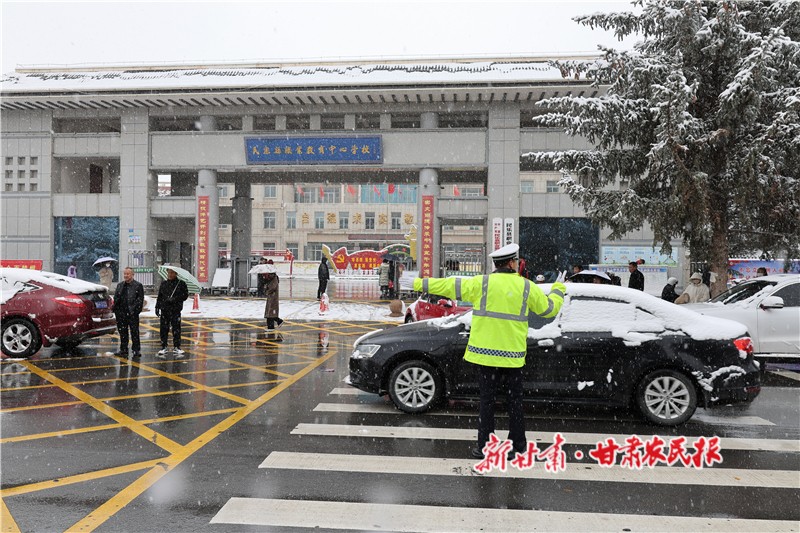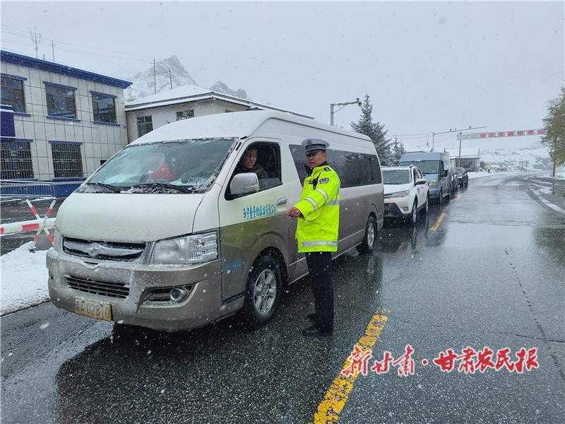 甘肃农民网讯 受冷空气影响,10月18日,民乐县迎来入秋以来首场降雪天气,路面湿滑,民乐县公安局交警大队以雪为令、闻雪而动,在城区重点路段、扁都口省级治安检查站执勤,确保雨雪天气辖区道路交通安全、有序、畅通,减少道路交通事故发生,全力以赴地投入到抗雨雪、保安全、保畅通工作中。