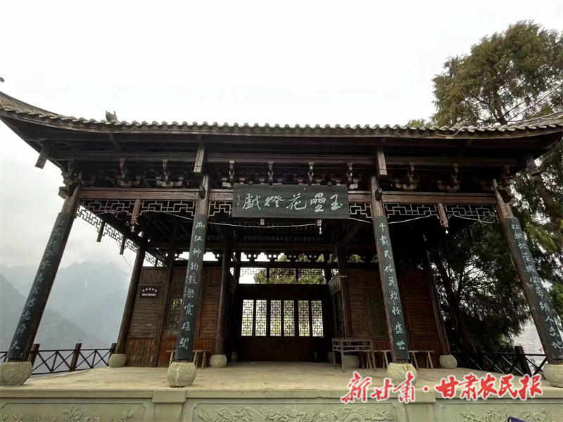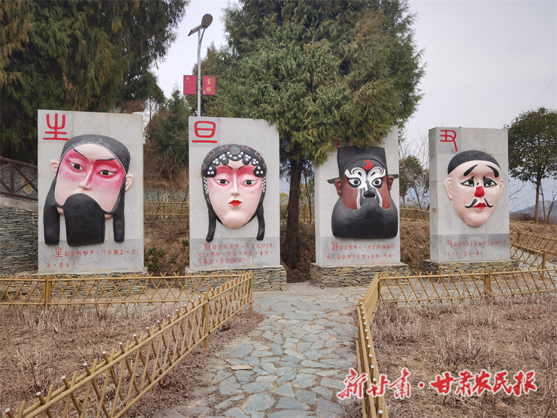 历史是根,文化是魂。往村内走,村子文化广场方向由生、旦、净、丑四块脸谱组成的玉垒花灯戏脸谱栩栩如生。据介绍,玉垒花灯戏最早约出现在明末清初年间,起初,剧情比较单一,在长期的流传过程中,经过历代民间艺人的不断丰富完善,在表演程式上借鉴了秦腔、川剧的特点,音乐唱腔上吸取了陇南民歌、小曲音乐等特点,使花灯戏从最初的秧歌剧中衍生而出,因生、旦、净、丑角色齐全故而成为一朵盛开的民俗文化奇葩。