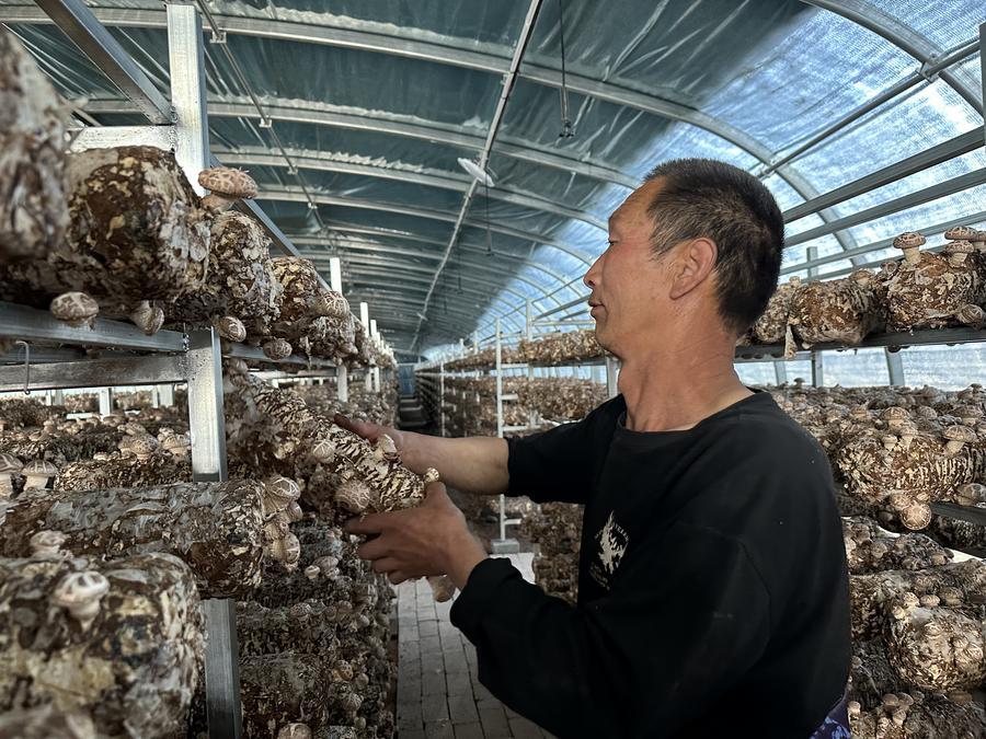 李明军在香菇大棚里采摘香菇(5月21日摄)。新华社记者 张文静 摄