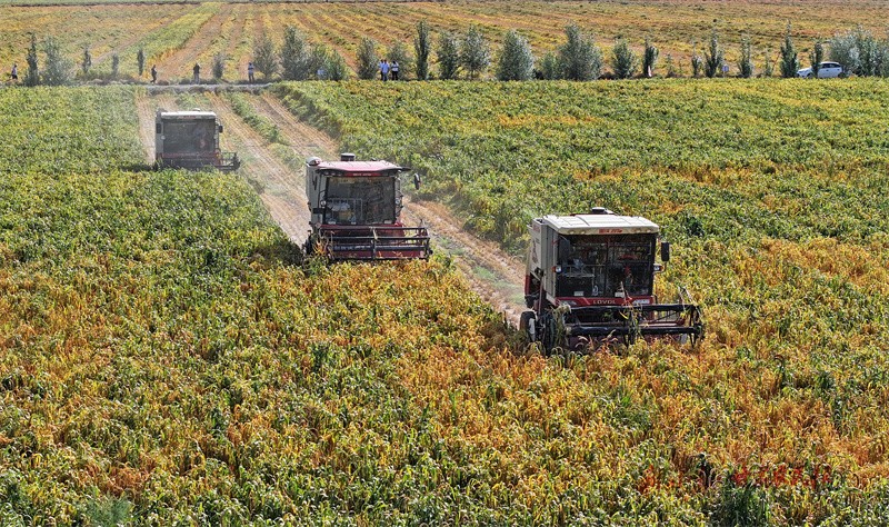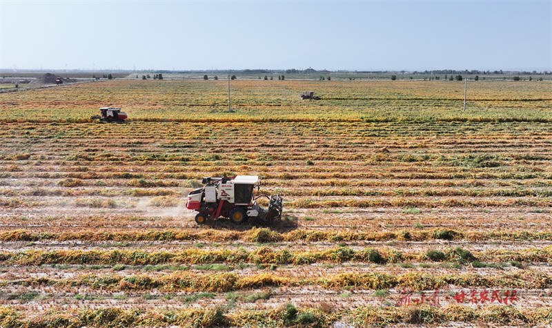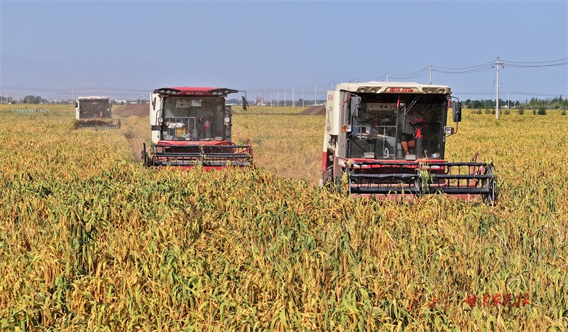 近日,在位于张掖市民乐工业园区的滨河集团万亩有机谷子种植基地,大型联合收割机在田间来回穿梭,机手们趁着晴好天气加紧收割谷子,田间地头一派繁忙景象。