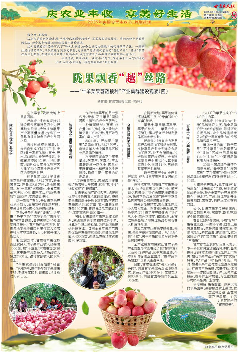 秋阳照耀,果香四溢。陇原大地的苹果园中,果香飘过黄土高坡,越过丝绸之路,正在向世界讲述着一个关于乡村振兴的“甜美故事”。