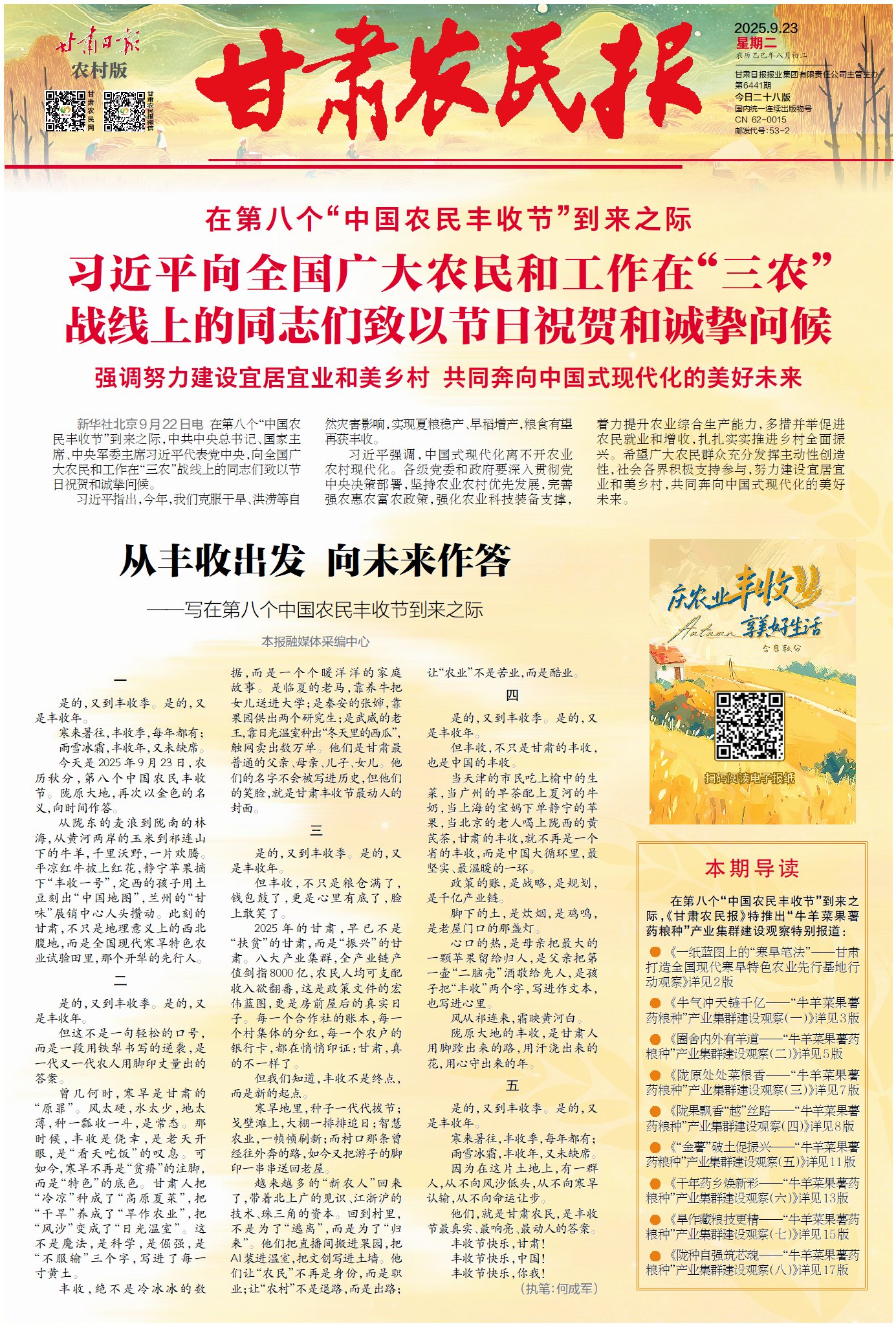 今天是2025年9月23日,农历秋分,第八个中国农民丰收节。陇原大地,再次以金色的名义,向时间作答。