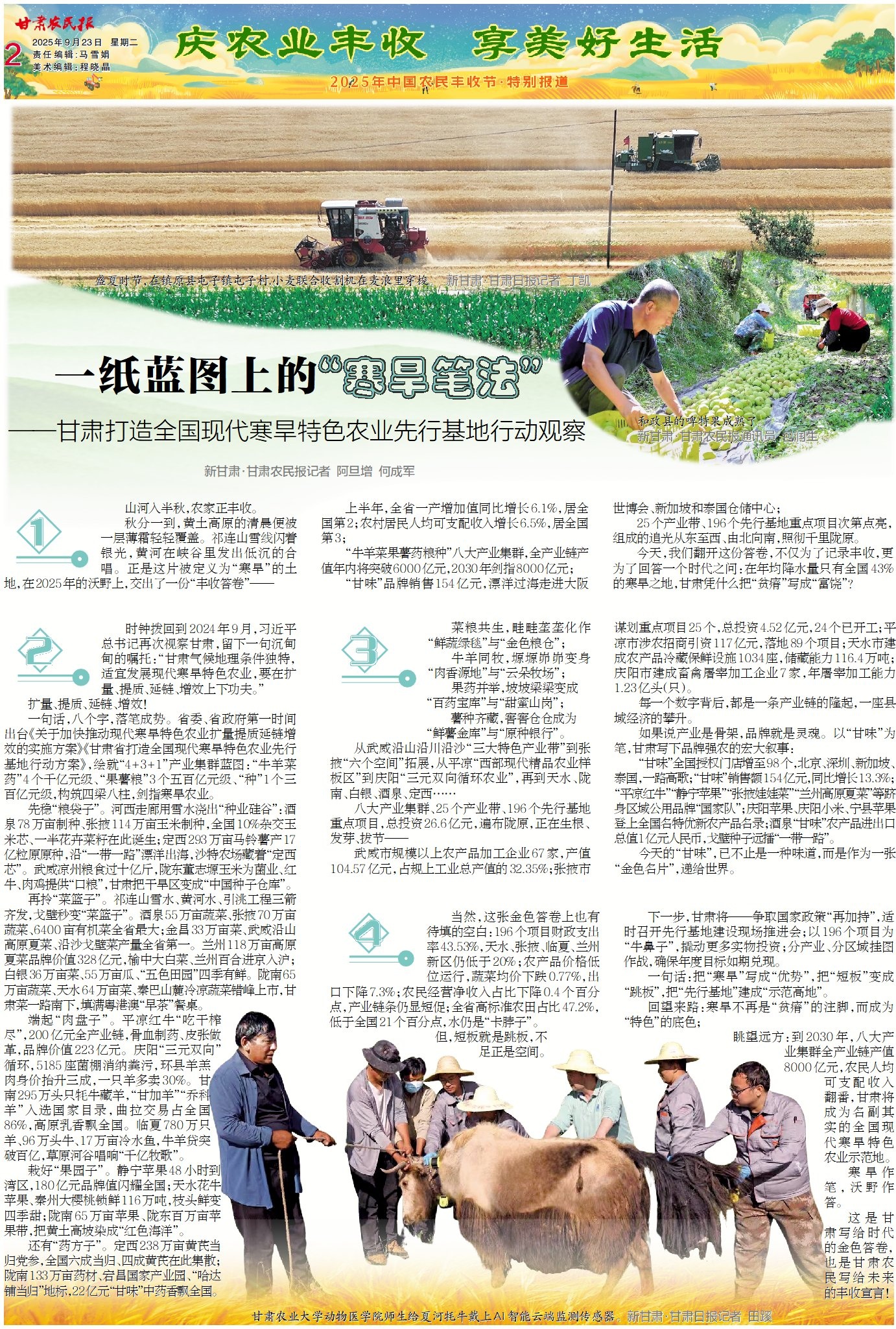 一句话,八个字,落笔成势。省委、省政府第一时间出台《关于加快推动现代寒旱特色农业扩量提质延链增效的实施方案》《甘肃省打造全国现代寒旱特色农业先行基地行动方案》,绘就“4+3+1”产业集群蓝图:“牛羊菜药”4个千亿元级、“果薯粮”3个五百亿元级、“种”1个三百亿元级,构筑四梁八柱,剑指寒旱农业。