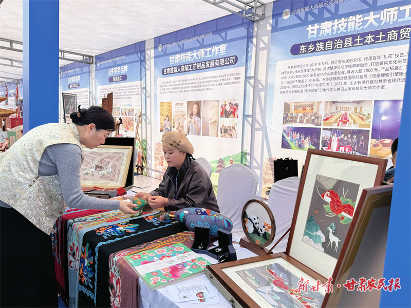 活动现场设置产品展示区,集中呈现两省特色产品与非遗技艺。临夏油炸面点、会宁杂粮、静宁苹果、微湖渔工等特色食品,与天水甘谷麻鞋、临夏腰刀、东乡刺绣、庆阳香包等手工艺品同台亮相,展现了两地深厚的文化底蕴与产业特色。