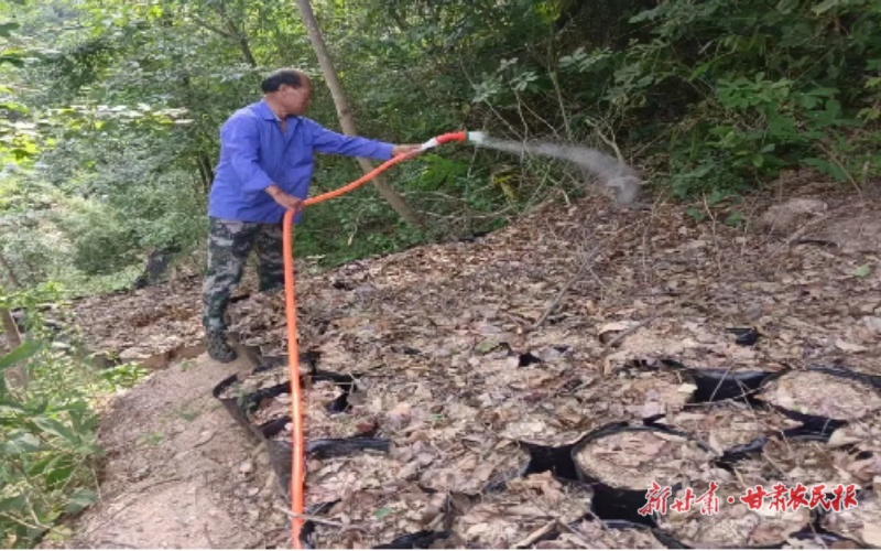 播种希望之后,更需要精心呵护。在康县郁郁葱葱的山林间,天麻延绵山头,种植户们精心地对天麻进行管护作业,有的拿着遮阳网布置遮阴,有的利用水管仔细浇水,还有的忙着给载种好的天麻盖上松软湿润的泥土……