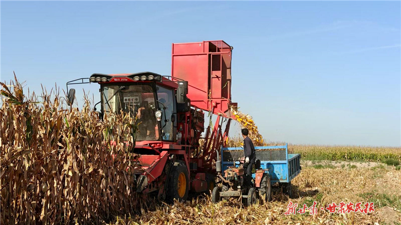 收割机高效采收玉米。新甘肃·甘肃农民报通讯员赵娅维 摄