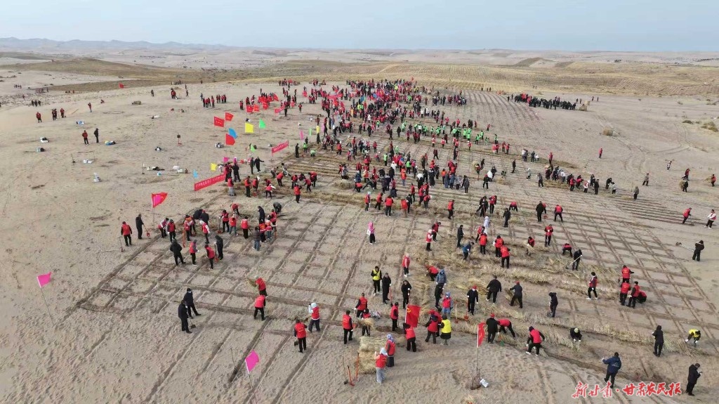 与曾经依靠人力的景象不同,如今在现场,压沙机开沟、无人机巡护已承担了大量工作。新技术的介入,显著减少了人力投入,也让治沙效率得到了提升。