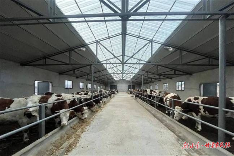 清晨的阳光洒满山梁,华亭市安口镇大坪村肉牛养殖基地里已响起阵阵牛鸣“哞……哞……”钢构大棚整齐排列,毛色光亮的西门塔尔牛和平凉红牛正悠闲进食,一旁的草料加工设备有序运转,为牛群提供科学配比的营养餐。