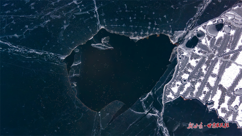从空中俯瞰,湖面如巨大的自然调色盘,冰似白玉,水如墨玉,纹理交织如抽象画作。成千上万的野鸭在此游弋、驻留,为凛冽冬日注入蓬勃生机,也成为当地生态环境持续向好的生动见证。(新甘肃·甘肃农民报通讯员 王雅霏 李肇一)