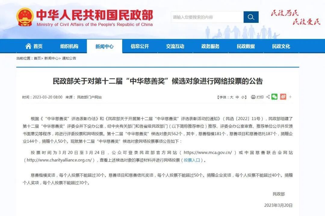 民政部3月20日发布对第十二届“中华慈善奖”候选对象进行网络投票的公告。