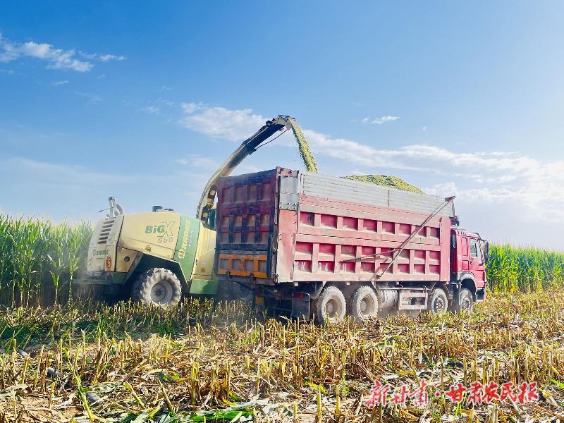 眼下,凉州区金塔镇千亩连片青贮玉米也迎来集中收割,走进种植基地,放眼望去,连片的玉米地郁郁葱葱,大型收割机穿梭其间,青贮玉米收割作业正高效推进。锋利的切割装置快速运转,将一排排籽粒饱满的玉米植株瞬间转化为均匀细碎的优质饲料。通过自动化输送系统,这些青贮料被精准装载到运输车辆,送往储存点进行科学贮藏。