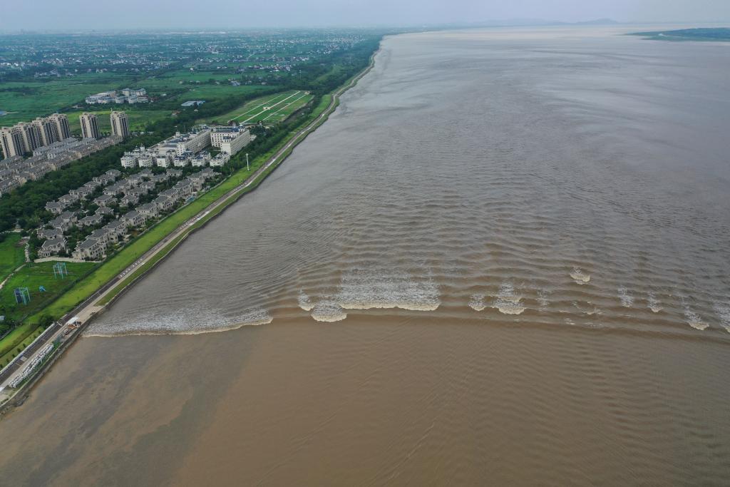 8月4日拍摄的钱塘江大潮“一线潮”(无人机照片)。新华社记者 黄宗治 摄