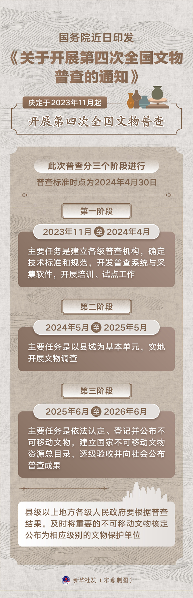 新华社北京10月27日电 国务院近日印发《关于开展第四次全国文物普查的通知》(以下简称《通知》),决定于2023年11月起开展第四次全国文物普查。