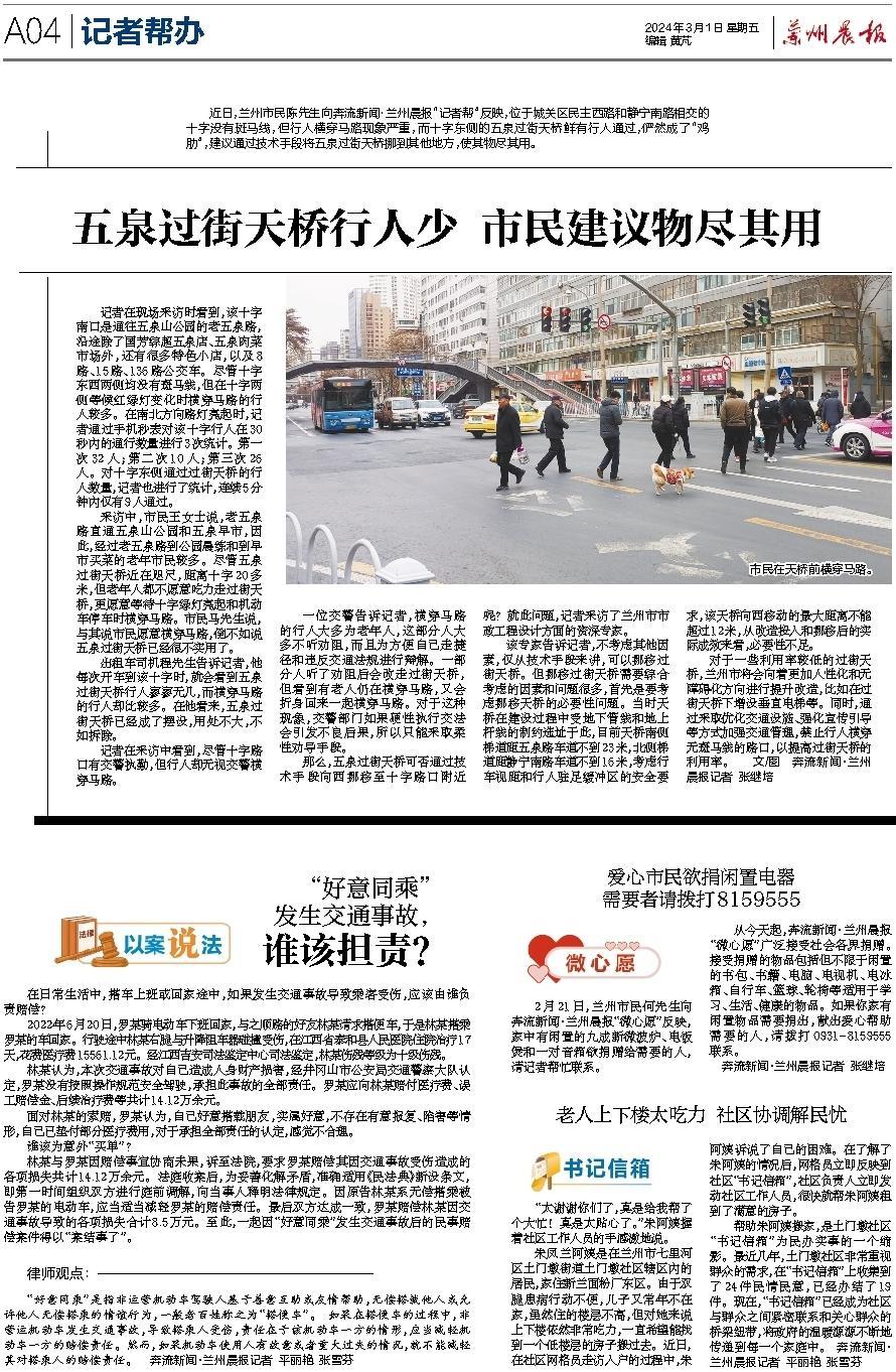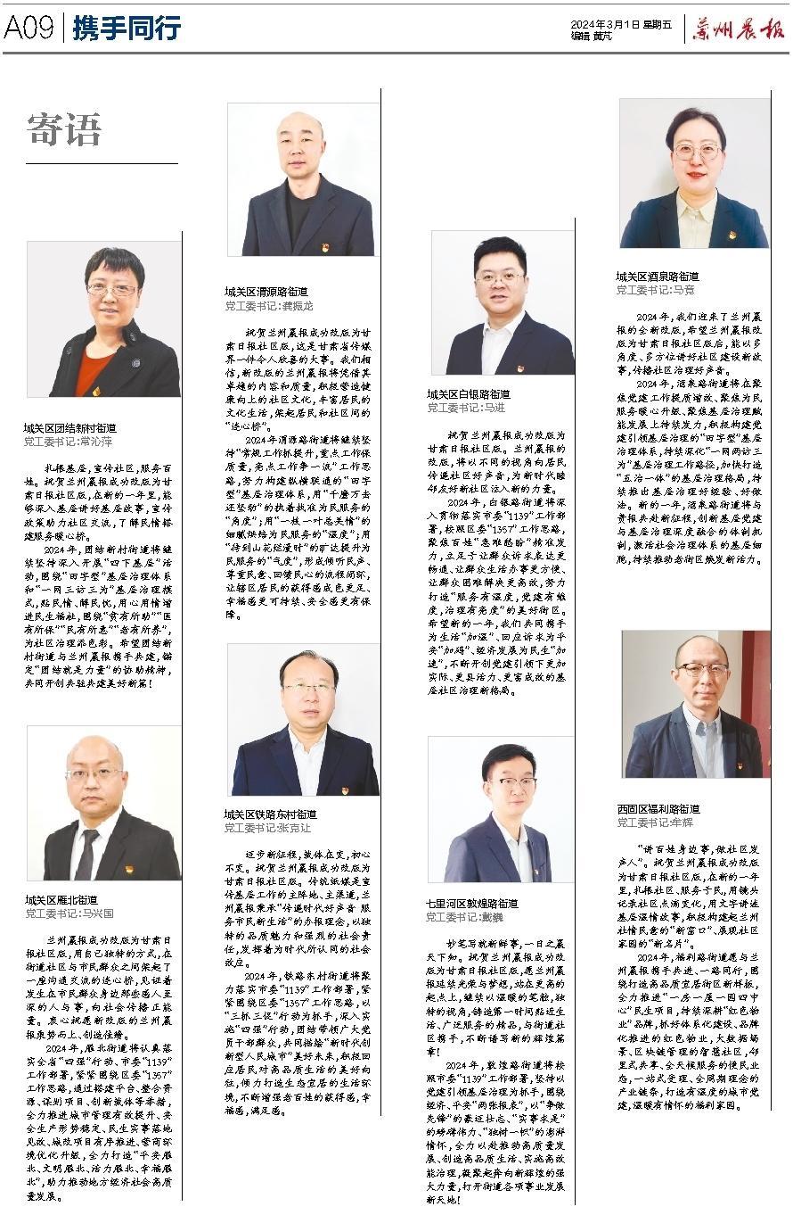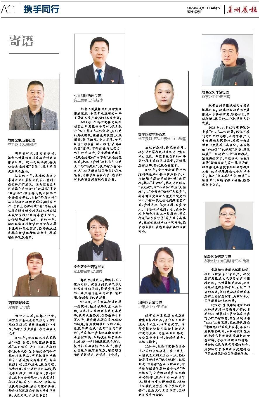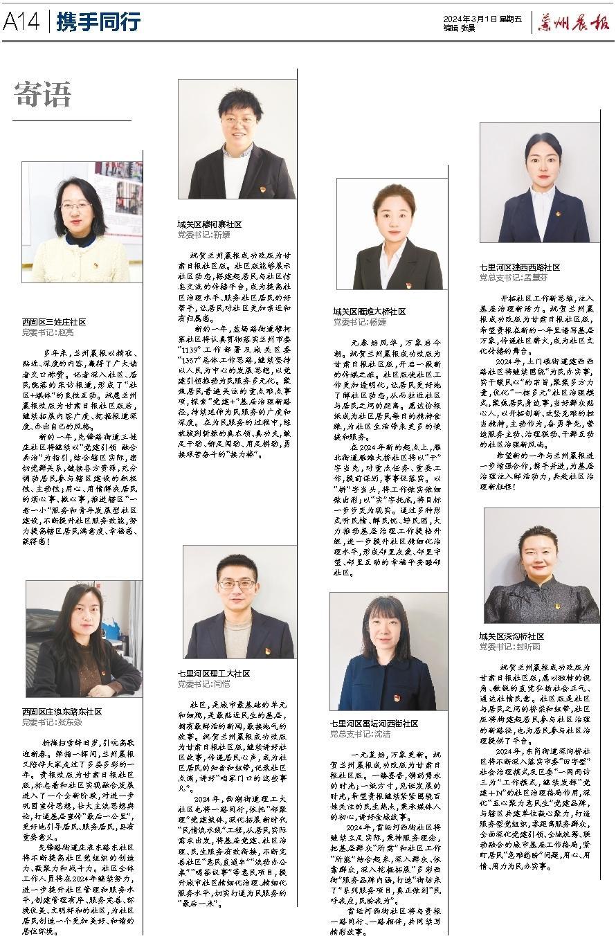 自1997年元旦创刊以来,兰州晨报已陪伴读者走过27个春秋,书写了甘肃报业的精彩华章,赢得了读者的信赖和广泛赞誉。近年来,兰州晨报立足于“甘肃日报都市版”的定位,以 “传递时代好声音,服务市民新生活”为办报宗旨,努力创新,锐意进取,不断提升报纸传播力和影响力。进入2024年,为适应新的媒体发展格局和市场变化,推进媒体深度融合发展,实现与奔流新闻“甘肃智慧社区服务云平台”同频共振,我们审时度势,充分利用记者队伍多年深耕社区的先发优势,调整办报方向,迈出转型改革新的坚实一步。