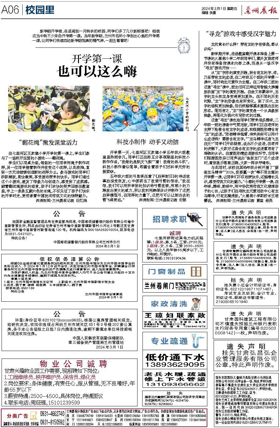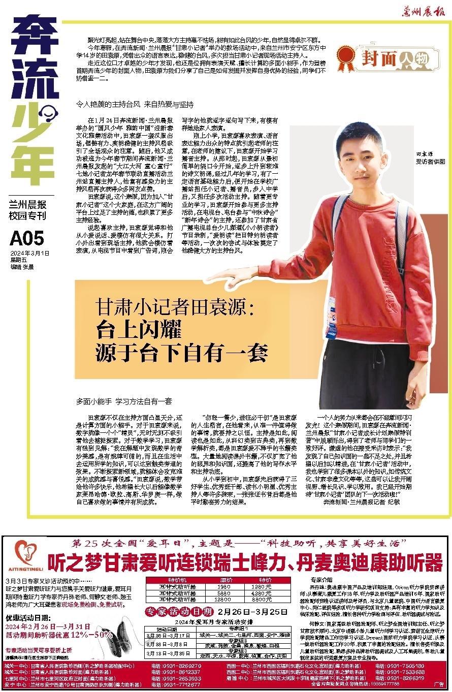 同时,依托奔流新闻“甘肃小记者团”,每周两期推出“奔流少年——兰州晨报校园专刊”,关注中小学校特色教育,陪伴少年儿童成长,搭建起学校、行业专家、主流媒体沟通交流的新平台,探索具有示范效应的中小学社会实践新模式。
