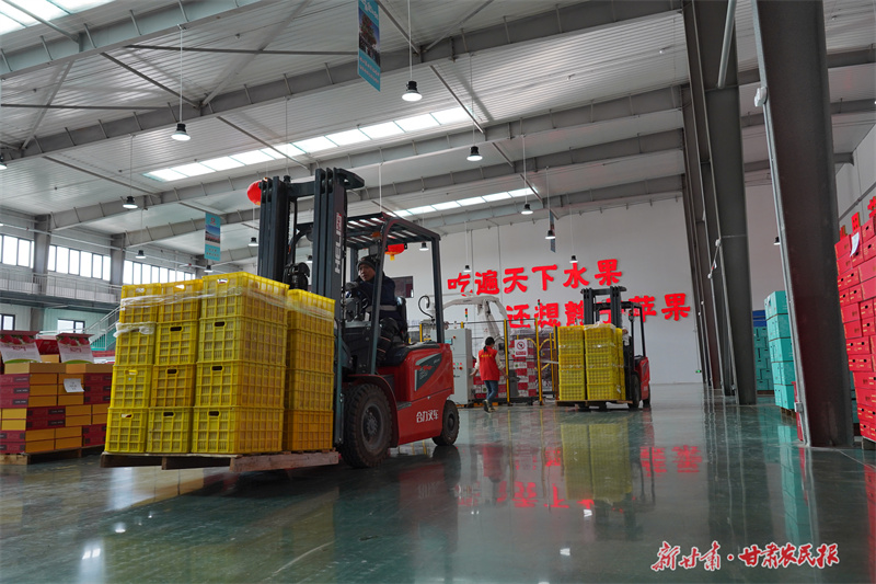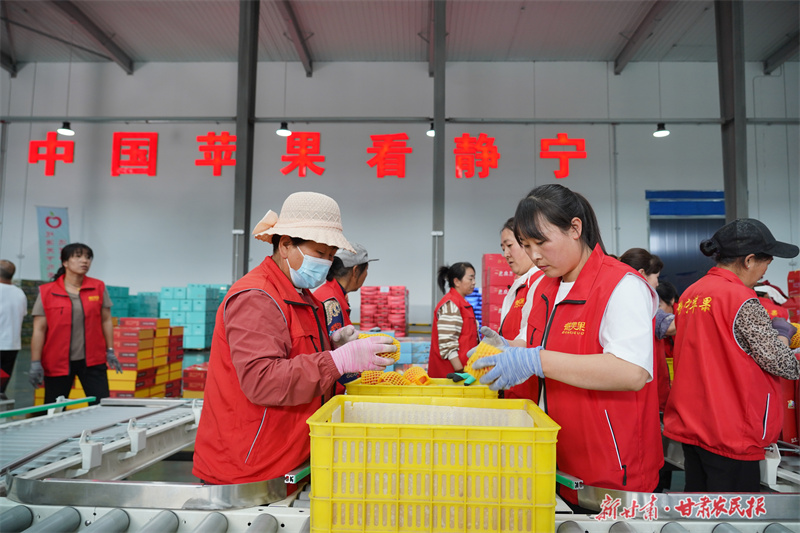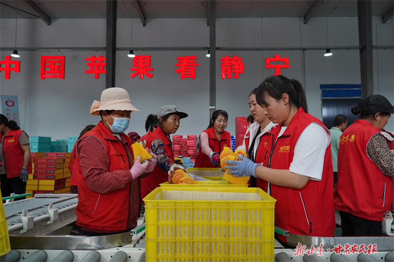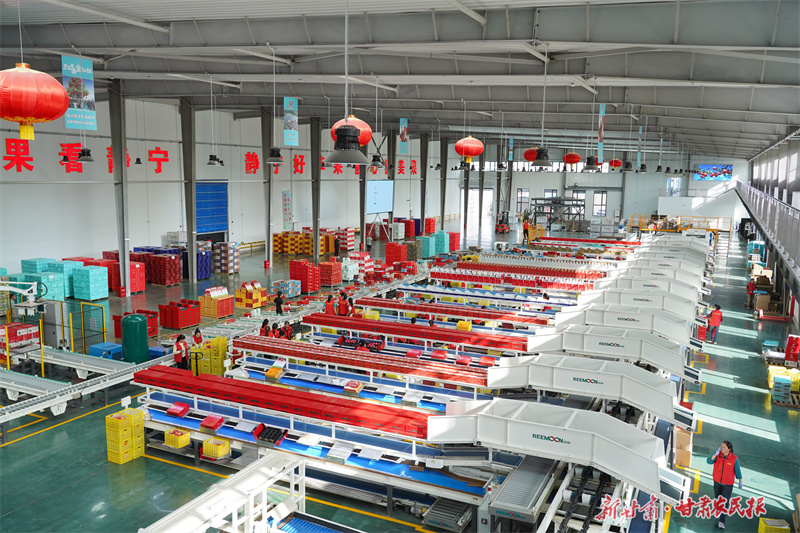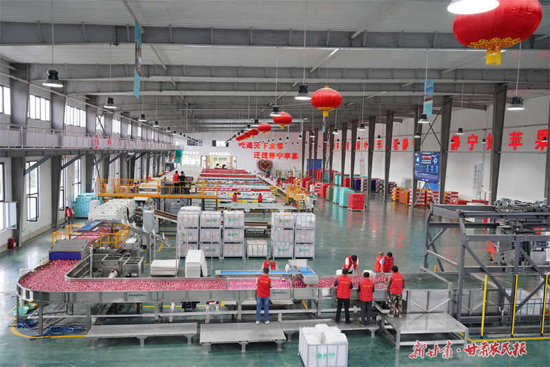 6月12日,在静宁县科创园内的智能化分选线上,工人们熟练地操作着设备,将冷库储存的苹果,根据其含糖量、大小、色泽、外观等特征进行分类筛选,确保每一颗苹果以更加优质的形象进入市场,满足消费者的需求。(新甘肃·甘肃农民报通讯员 吴玺 李童晖)