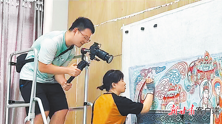 2024年8月23日,甘肃国际传播中心记者在敦煌研究院美术室拍摄壁画临摹的场景。