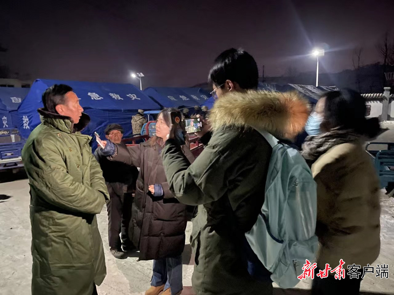2023年12月21日晚,甘肃日报社、甘肃新媒体集团全媒体记者在积石山县尕集村地震受灾集中安置点采访报道。