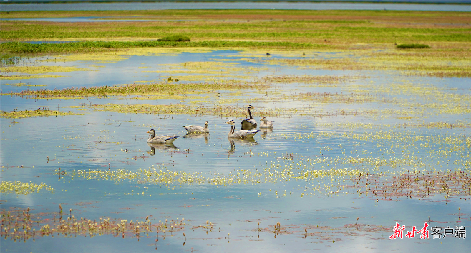 “那两只身长羽白、颈黑顶红的是国家一级保护动物黑颈鹤,周边的鸟儿,是斑头雁和赤麻鸭,总共有三四百只。”尕海保护站技术员孟繁森告诉记者,湿地内水鸟总量每年保持在3万只左右。