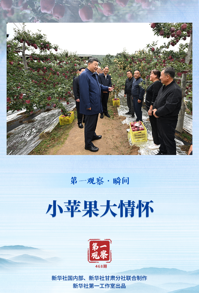 9月11日上午,习近平总书记来到甘肃天水市麦积区南山花牛苹果基地考察。新华社记者定格了这样一个瞬间——