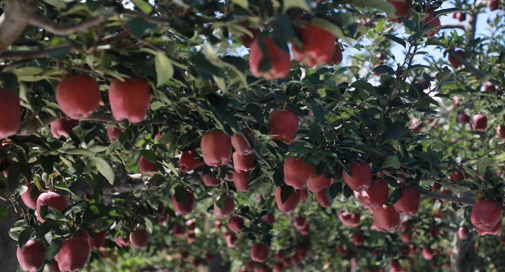 连片的苹果树生机勃勃,色泽浓红、五棱突出、果形高桩的花牛苹果,缀满枝头。每棵树挂果200多颗,重量达100多斤。正值采摘季节,果农已将成熟苹果放入筐中,经历分拣、转运等流程后,准备销往各地。