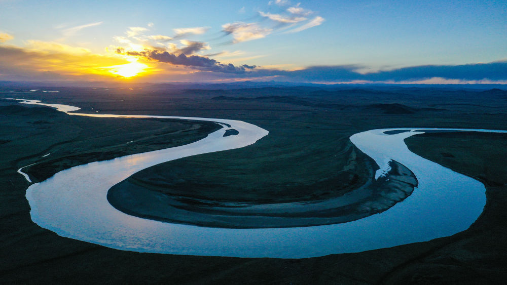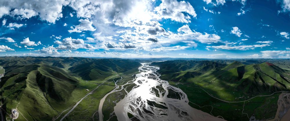 2024年7月31日在青海省果洛藏族自治州达日县境内拍摄的黄河(无人机全景照片)。