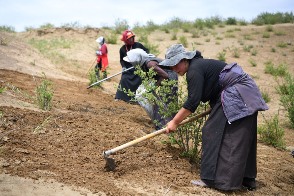 2023年7月6日,牧民在甘肃省甘南藏族自治州玛曲县欧拉镇黄河沿岸一处沙化草原治理点补种草籽。