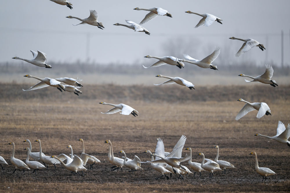 2024年3月16日在内蒙古呼和浩特市托克托县黄河湿地拍摄的天鹅。随着当地生态环境持续改善,候鸟数量连年增加。