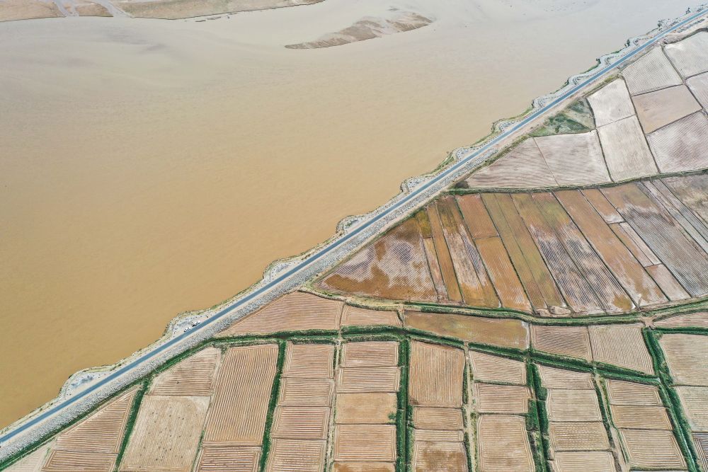 2024年5月26日在内蒙古巴彦淖尔市临河区拍摄的黄河(无人机照片)。巴彦淖尔市位于黄河“几字弯”北端,拥有富饶的河套灌区,引黄灌溉面积达1000多万亩。近年来,在引黄灌溉工程支撑下,河套灌区年均粮食总产量达60亿斤以上。