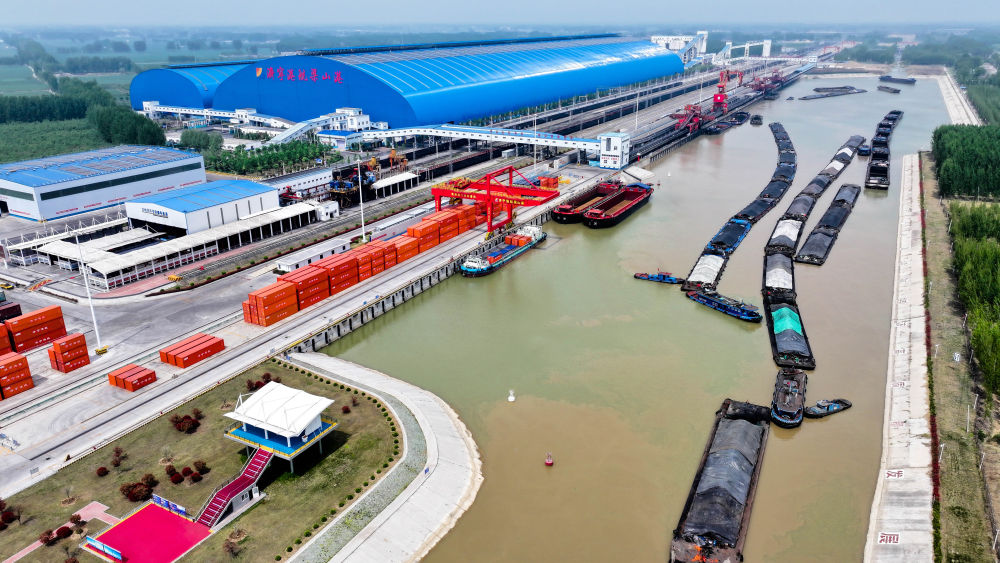 2024年4月24日,船舶行驶在山东济宁港航梁山港航道上(无人机照片)。近年来,山东省加快构建沿黄陆海大通道,有效促进黄河流域各省区物流降本增效,实现更高水平对外开放。