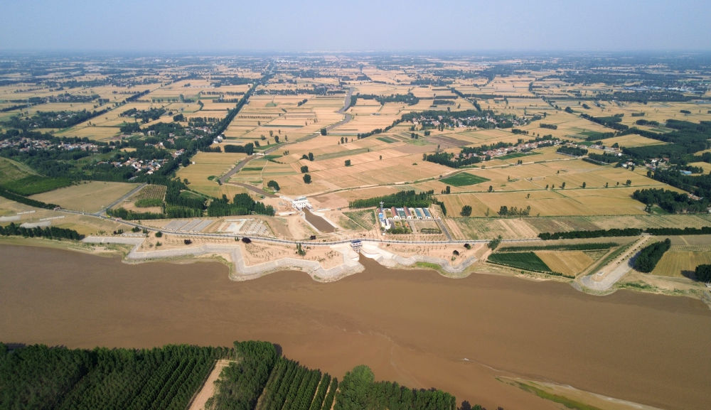 2024年6月19日,位于黄河高青段的马扎子引黄闸开闸引水(无人机照片)。5月1日至6月18日,山东省累计启用引黄闸63座,引黄河水量10.06亿立方米,保障农业灌溉需求。