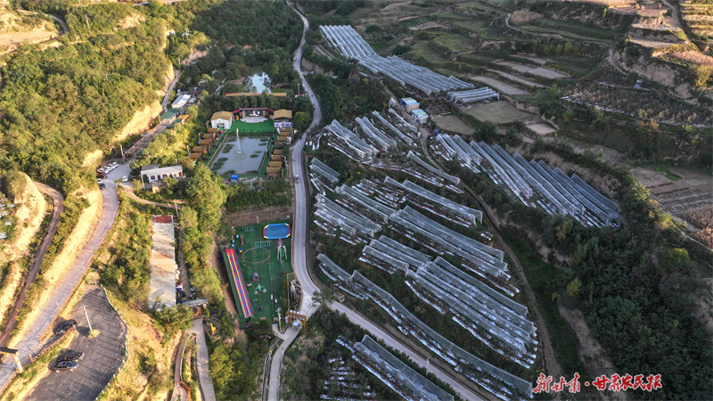 无人机的视角下,庄浪县朱店镇吴沟村的农舍整齐排列,硬化的水泥路延伸至果园深处,色彩斑斓的景观长廊点缀其间,构成了一幅动人的乡村画卷。