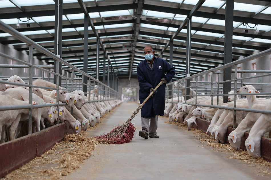来自陈家村的饲养员马尕西木挥动扫帚,正在清扫羊舍。“喂羊、打理圈舍,不是什么重体力劳动,离家也近。”马尕西木说。