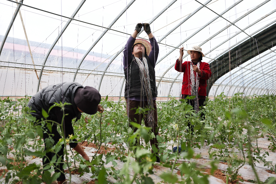 在积石山县灾后农户产业扶持项目韩陕家蔬菜大棚,一株株嫩绿的樱桃番茄苗长势喜人。工人正手持剪刀,小心翼翼地为每株秧苗做植保、拉吊绳。