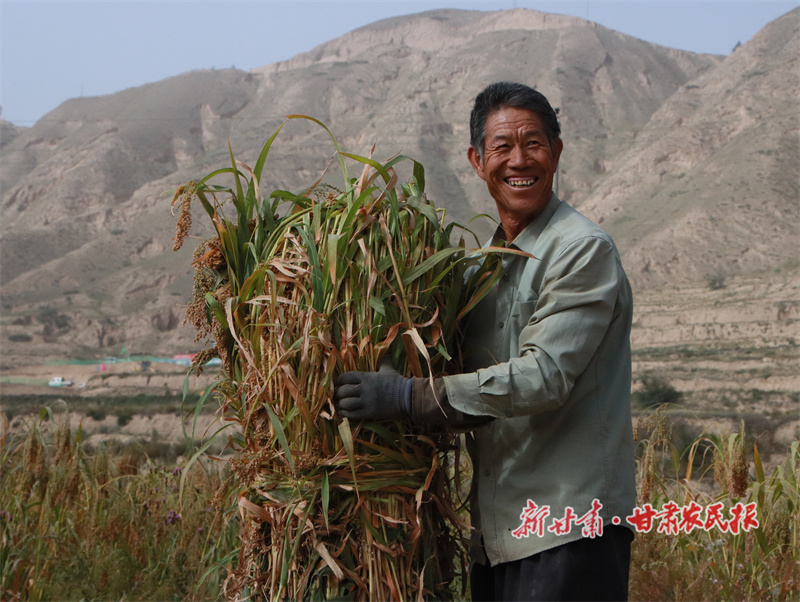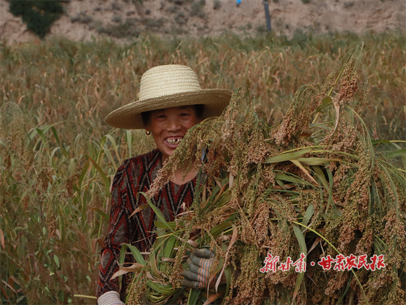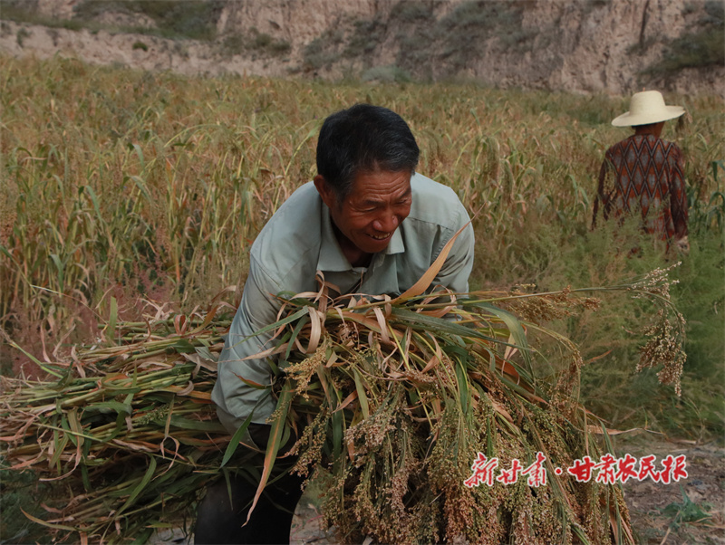 眼下,会宁县大片糜子进入成熟采收期。走进会宁县新庄镇泉坪村糜子种植基地,一串串颗粒饱满、沉甸甸的糜穗挂满枝干,放眼望去,金灿灿的一片,景致迷人,村民们正在收割、扎捆,脸上洋溢着丰收的喜悦,一片片金黄色的糜子田犹如金色的海洋,与百姓的笑脸相映衬,山间田野呈现出一幅美丽的丰收画卷。新甘肃·甘肃农民报通讯员 牛丽娜 张馨月