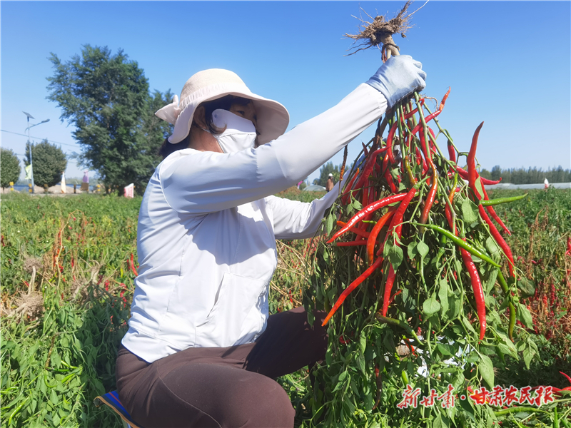 金秋时节,高台县南华镇胜利村千亩辣椒示范基地里,红彤彤的辣椒挂满枝头,村民们手指翻飞采摘装袋。田间地头堆满鼓鼓囊囊的袋子,空气中弥漫着丰收的喜悦。
