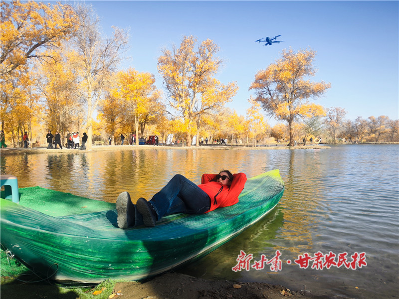 “每天要拍摄70人左右。”庹智超将弟弟拍摄完成的镜头现场剪辑,在他的相机里,无数游客与胡杨的相遇被定格。碧舟、游客、蓝天、倒影,这些都在金色的胡杨林中找到了最美的注脚——它们不是主角,却让主角的光芒更加璀璨。