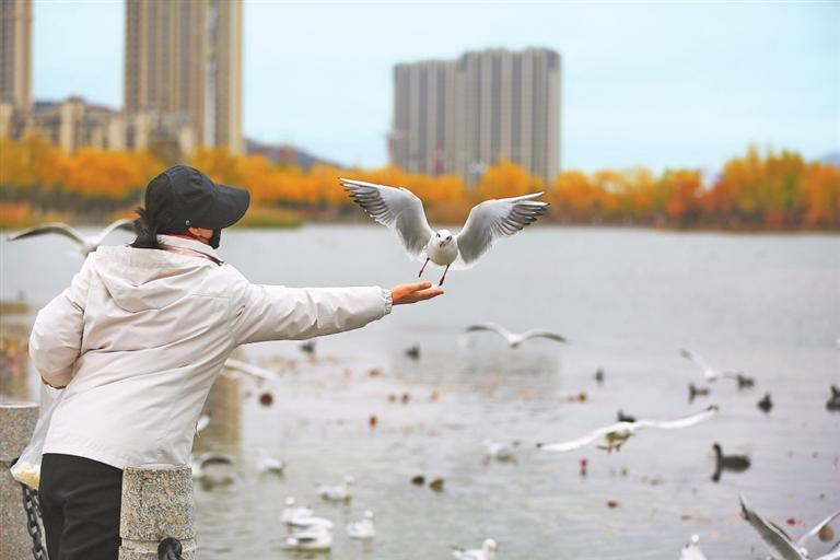初冬时节,定西市民与候鸟互动。新甘肃·甘肃日报通讯员 王克贤