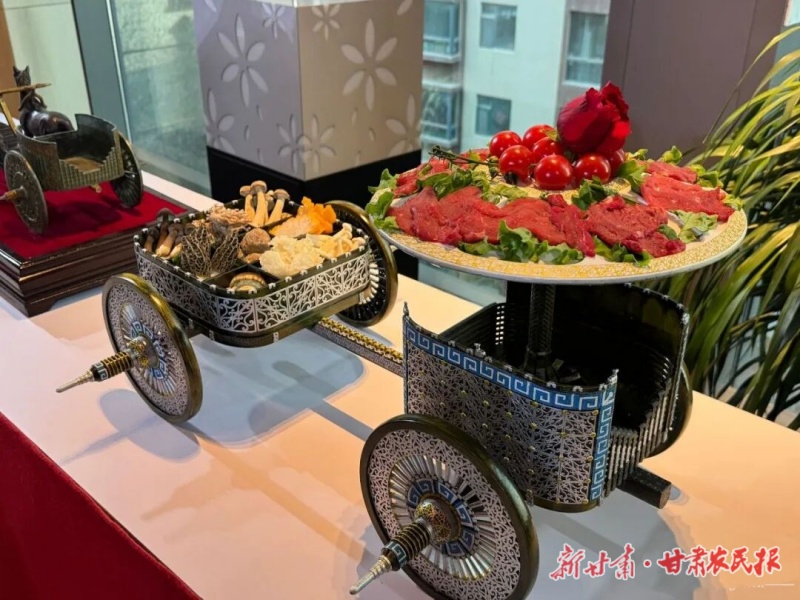最“吸睛”的还属战国马车红花牛展示餐具。马家塬战国马车载着千年西陲的商贸记忆,而今变作精巧展台。只见鲜切红花牛肉如锦绣铺陈,古今滋味便在此交汇——马家塬的车轮曾驰骋丝路,如今红花牛正沿新丝路香飘远方。