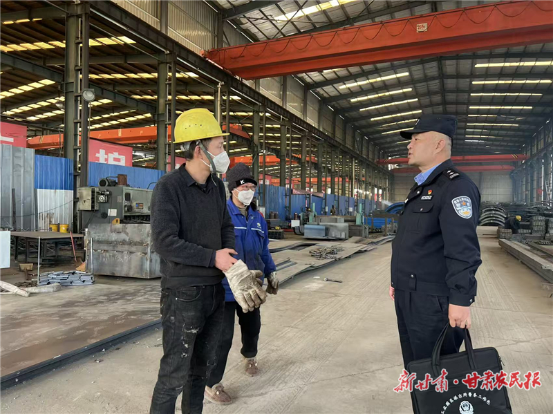 日头斜过锌钢板厂房的尖顶,民乐县工业园区裹着细沙的风,正簌簌擦过水泥路面。这片沿戈壁铺开的园区里,厂房新旧交错,有些墙皮已被风蚀得泛白。民警王国栋压了压帽檐,辅警小张在一旁仔细核对着门牌,两人一前一后,走向又一间厂区。