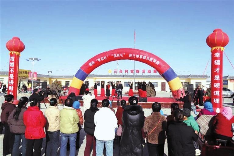 前几天,苏武镇三合村村委会门前热热闹闹,高悬的彩柱上“结婚不是拼财力,幸福才是硬道理”的字眼格外醒目,一场倡导“零彩礼”“低彩礼”践行婚事新办新风尚的演出正在火热进行。