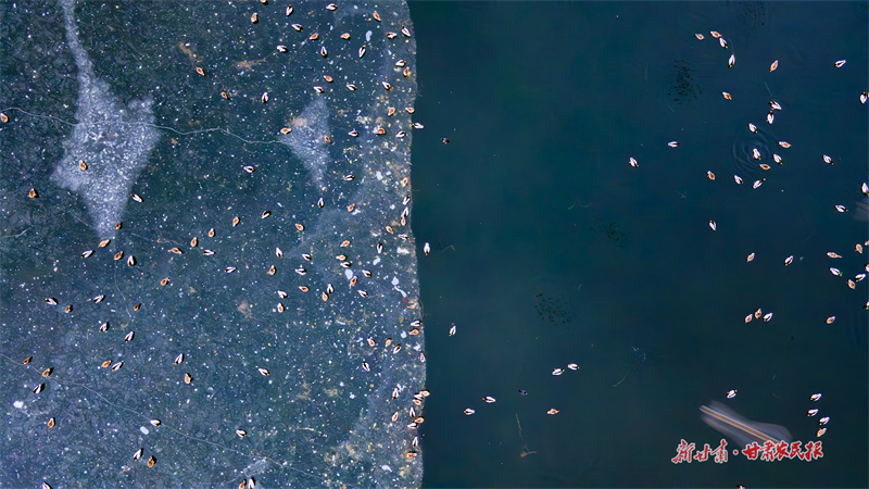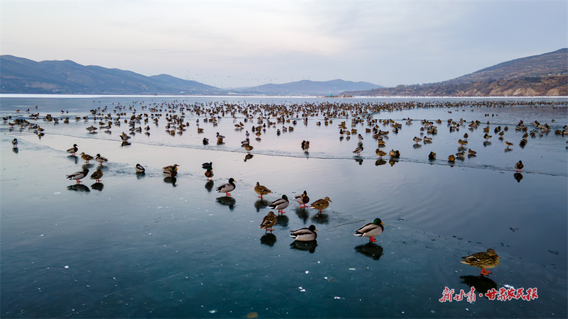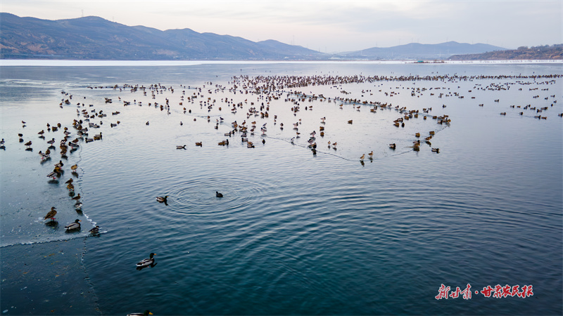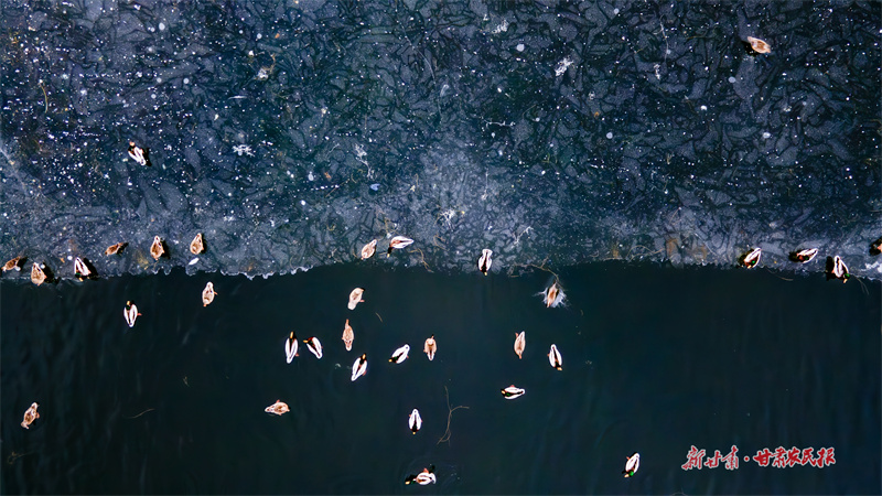从空中俯瞰,湖面如巨大的自然调色盘,冰似白玉,水如墨玉,纹理交织如抽象画作。成千上万的野鸭在此游弋、驻留,为凛冽冬日注入蓬勃生机,也成为当地生态环境持续向好的生动见证。(新甘肃·甘肃农民报通讯员 王雅霏 李肇一)
