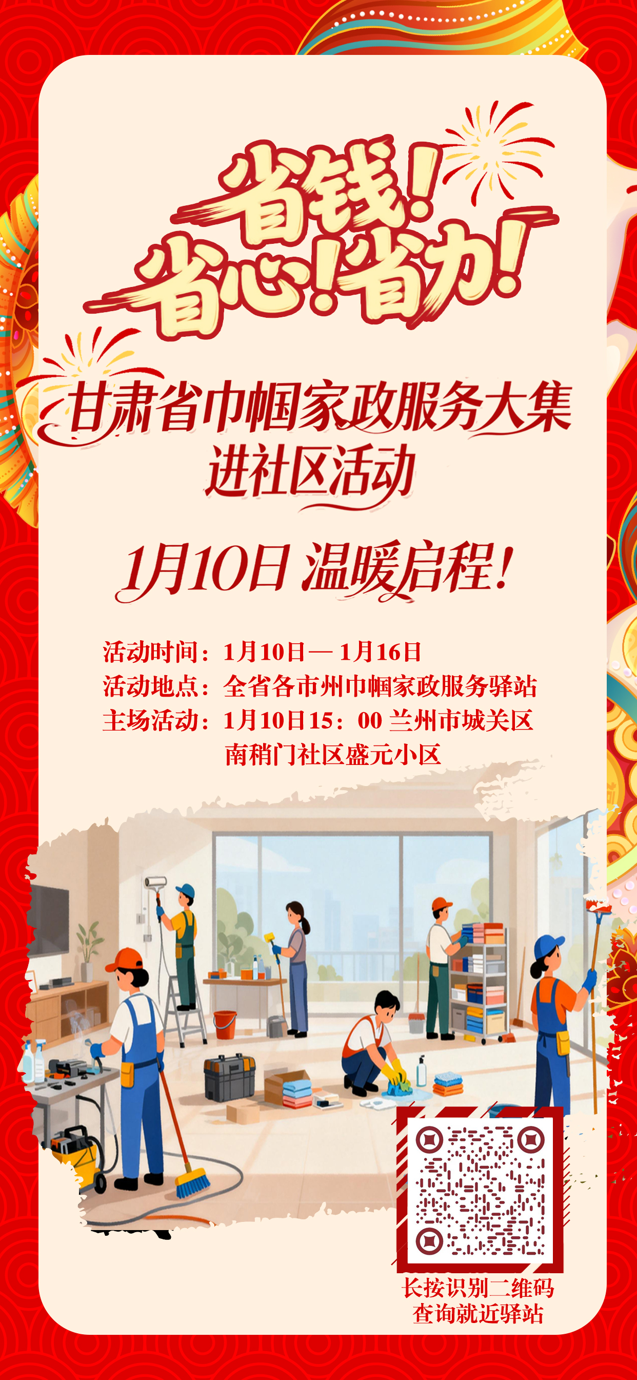 甘肃农民网讯(新甘肃·甘肃农民报记者 马雪娟)1月9日,记者从省妇联获悉,甘肃省“巾帼家政服务大集进社区”活动将于明日(1月10日)正式启动。1月10日至16日,这场惠民服务大集将在全省范围内铺开,依托各市州“巾帼家政服务驿站”,将专业、暖心的家政服务送到居民楼下。