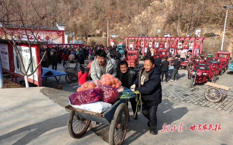 村民们用小推车将年货搬回家。新甘肃·甘肃农民报通讯员 唐亚春 摄