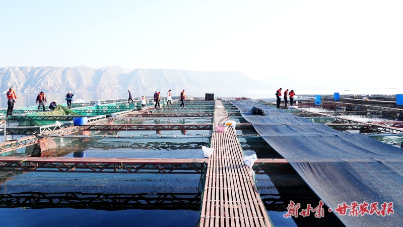 清晨的刘家峡水库,薄雾轻笼,碧波万顷。渔民们驾着小船驶向养殖区,渔网起落间,金鳞闪耀、水花飞溅,黄河鲤鱼、三文鱼、金鳟、虹鳟等各式鱼类竞相跃出水面,勾勒出一幅丰收渔乐图。作为黄河上游重要的水源涵养地和生态屏障,刘家峡水库总库容57亿立方米,水域面积达16万亩,常年保持Ⅱ类优质水质,水温稳定、溶氧充足,为淡水鱼类生长提供了得天独厚的自然条件,也让这里成为甘肃最大的水产养殖基地。